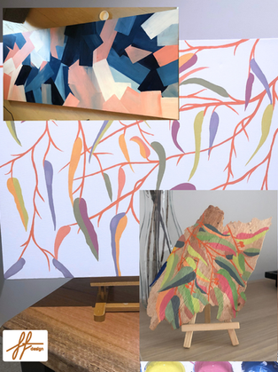 Painted Leaves is rooted in two original acrylic artworks painted during the early years of building a home and life with my husband. Inspired by the elongated, irregular leaves of Australian gum trees, the collection blends personal reflection with natural beauty. Soft textures and hand-painted strokes preserve the emotional stillness of the painting process, making these designs ideal for home textiles, stationery and décor that feel grounding, warm and heartfelt.